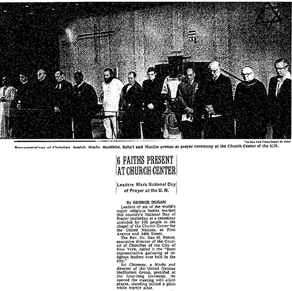 "Sri Chinmoy, a Hindu and director of the United Nations Meditation Group, presided at the hour-long ceremony. He opened the meeting with silent prayer, standing behind a plain white marble altar.
