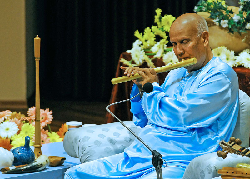 Sri Chinmoy typically began each Peace Concert with a short meditation and then during the concert, he would sing and play several instruments, such as the flute, esraj, cello and synthesier/piano. Apart from a few Sanskrit mantras, Sri Chinmoy mostly performed his own compositions. Sri Chinmoy was not a trained musician but self-taught and often performed extemporaneously.