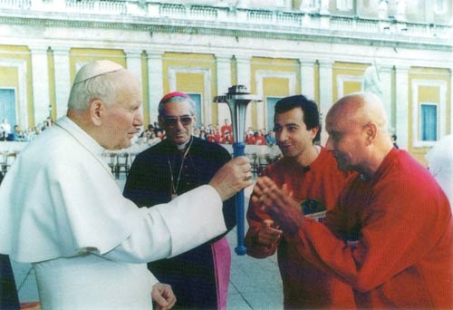 The fourth audience with Pope John Paul II took place just before the Pope's weekly Mass for 15,000 people. Sri Chinmoy offered the Pope the Peace Torch with the words.